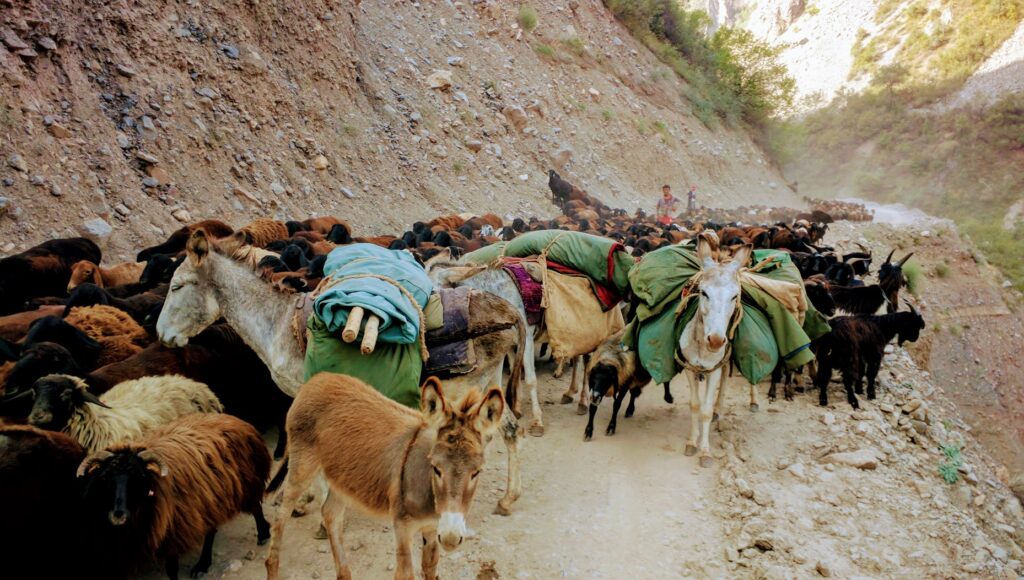 After a good breakfast with bread, honey, coffee and milk we greeted our host and me and the polish cyclists parted. The area was now very different, almost magical. The mountains irregular, harsh, and the Obikhingou river on the bottom was really noisy and powerful. On my way I could see the beauty of those valleys, and even got traffic in “pamir traffic”, as sometimes herds of goats, sheep and donkeys would trap me on the road.