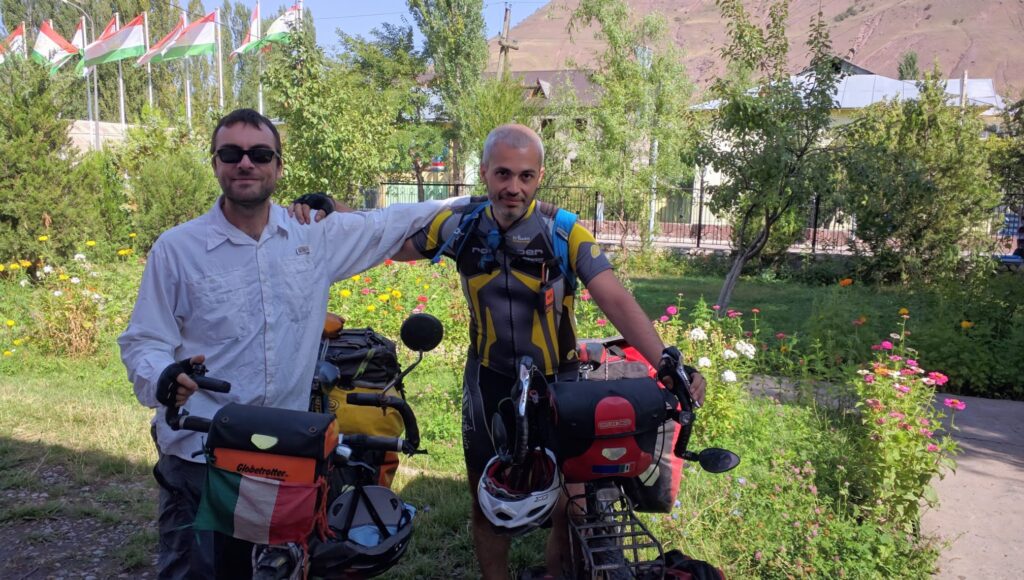 The kms were going very slowly, and I was not feeling all that great. I thought it was the heat, I was also strangely having sour stomach. I decided to stop, eat something and send some messages and selfie kisses to my girfriend. I prepared some of the dry noodles I had with me for these cases, and grabbed some Nutella (bought in Dushanbe) for extra energy. I kept going forward , today’s stop was supposed to be in Tavildara, where I’d find a hotel. I arrived there early enough, the village seemed more modern and orderly. It was rebuilt after a devastating flood, I learned. While waiting to get to my room I met there.. Ruggero On Tour! The very first and only other Italian I had ever met on the road in all these years.